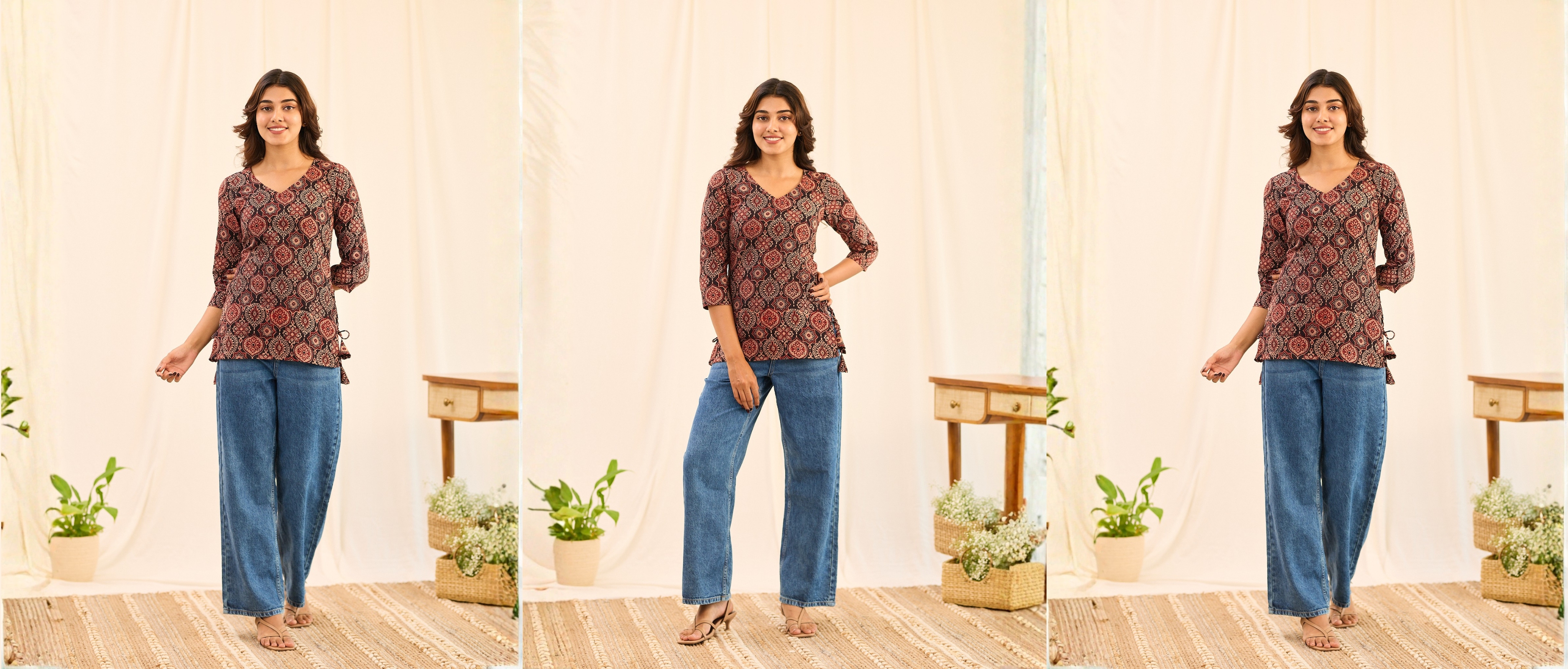 Brick Red with Beige Ajrakh Printed Cotton Short Kurti
