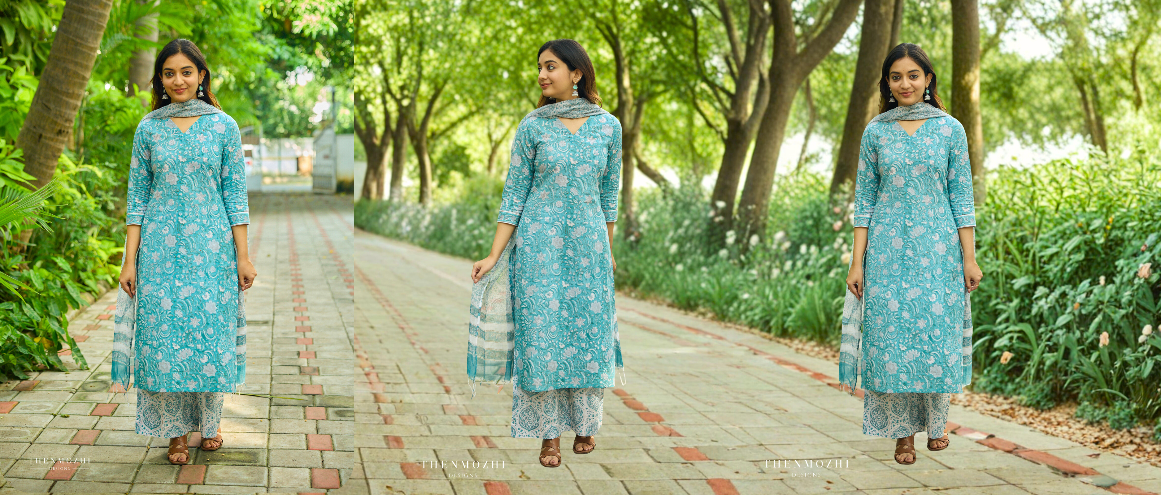 Teal Blue Floral Block Printed Cotton Suit Set With Kota Dupatta