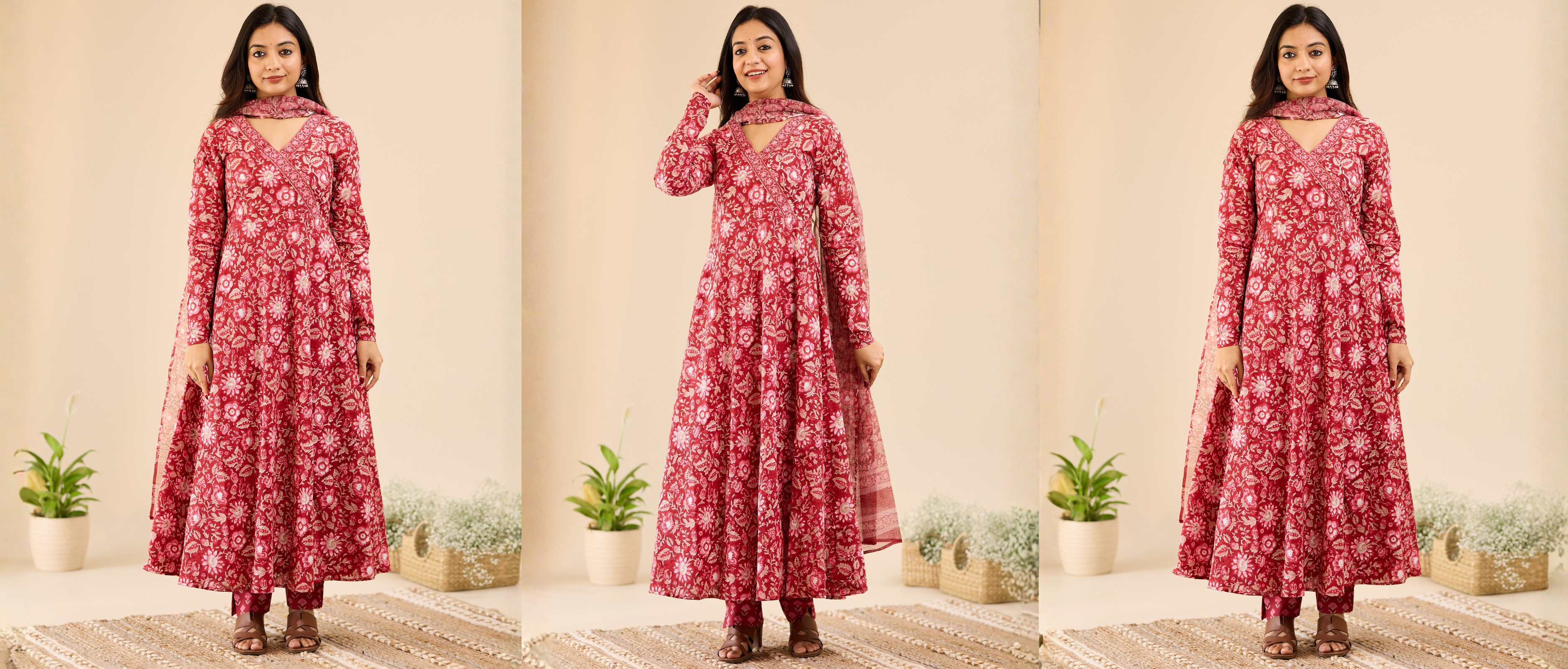 Deep Crimson Red Floral Anarkali Salwar Suit- Set with Kota Dupatta