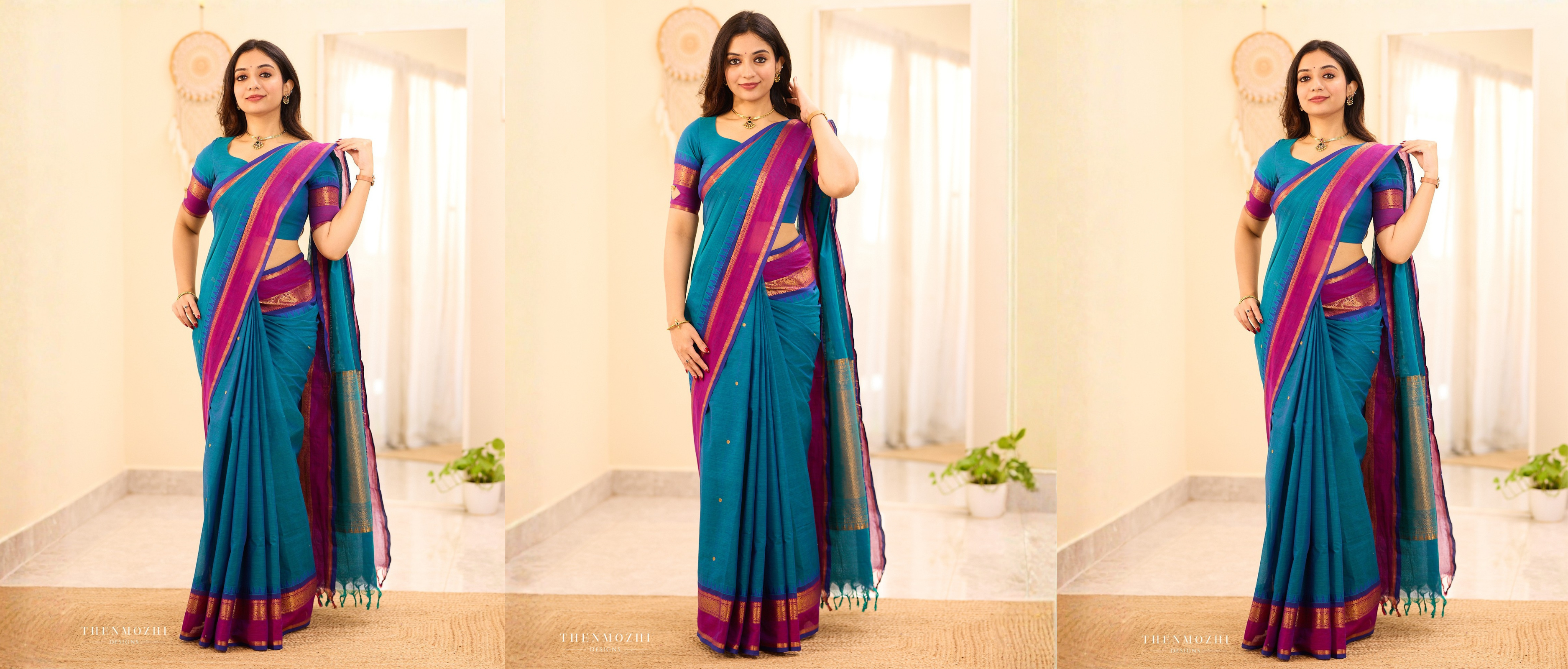 Teal Chettinad Cotton Saree with Wine Zari Border