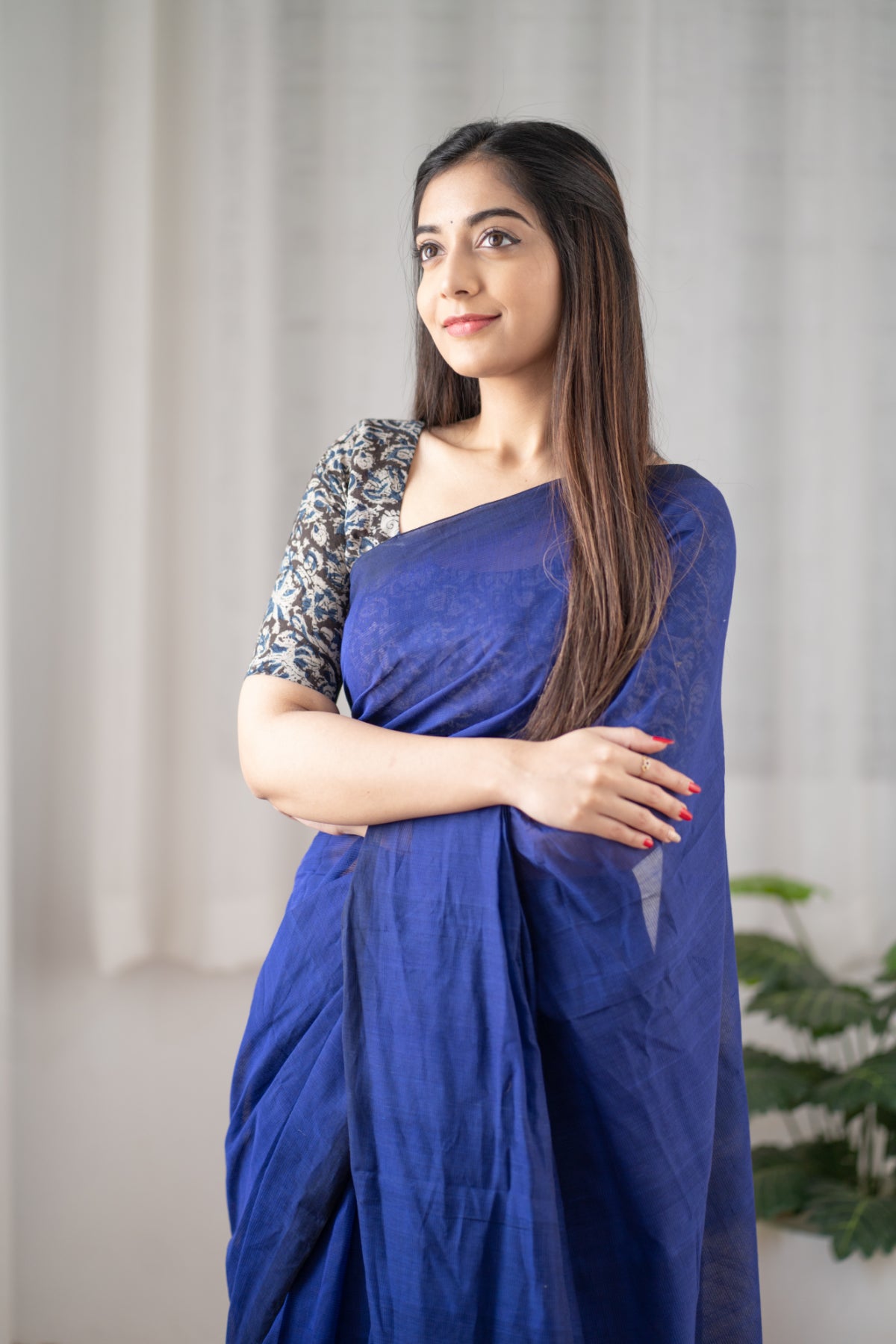 Navy Blue & Green Mangalagiri Plain Cotton Saree